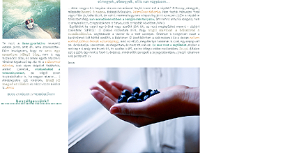 Új design? Egy egyszerű, blogos kinézetet láthatunk, melynek hangsúlyos színei a kékeszöld, a zöld és egy fakóbb narancssárga. Ezáltal megteremtődik egy hűvös, de kellemes hangulat, amelyet sikerült a kisképekkel mégis nyáriassá változtatnod. A színek nagyon tetszenek, a linkeffektekbe pedig egyenesen szerelmes vagyok - bár a dőlt betűkhöz valami még fakóbbat használtam volna, mondjuk egy #AE9483-t az egyik csipetőről a második kisképen. A modulfejlécekkel sem vagyok teljesen megelégedve, a helyedben a háttér színét használtam volna, és mellőztem volna a pontocskákat. Ezeket az apró tökéletlenségeket azonban hajlandó vagyok megbocsájtani, hiszen a hangulat mindenért kárpótol. :)