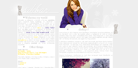 Második design: Mila a főszerepben - és bár a lila dominál, de egy csomó tök jó, barátságos színnel találtam még magamat szembe. Nagyon jó ötlet volt, hogy Mila képei ilyen színesek és így kerültek be az oldalmodulokba, ezek adják meg az alaphangulatot, ami nekem nagyon bejön! A modulfejlécek rendben vannak, akárcsak a modulháttér és az alapbetűszínnel sincs semmi gond, jól olvasható. A formázások egytől-egyik rendben vannak, passzolnak az összképbe. A háttér is jól lett megcsinálva, ez kellett ide befejezésnek. A kellő rendezettség simán megvan, sőt, tetszik, hogy minden a helyén van a lapon. Szeretem az ilyen összeszedett oldalakat! Ennek van összhatása és tetszetős, személyes oldalhoz illő összkép fogad minket a lapra fellépve. Remélem a további külsők is ilyenek lesznek, én ezzel elégedett vagyok, teljességgel rendben van - grat hozzá!