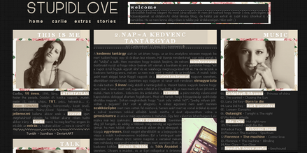 Új design? Selena Gomez kapott főszerepet a diziben, s nagyon szép képeket válogattál össze róla, viszont csúnyán el lehet rontani egy rosszul sikerült színezéssel. Itt sajnos ez történt. Úgy érzem kicsit túlzásba estél, hiszen a kevesebb néha több és csak egy árnyalatnyi világosítással sokkal jobb fotókat kaptunk volna. Az egész fejléc elgondolása remek, csak sajnos túl világos. Selenáról a kép csúnyán el lett színezve, az alatta lévő csík pedig ötletes, de nem értem miért kellett többször ráírni a nevét, elég lett volna egyszer, mert így elég zavaró. Maga a szövegdoboz szuperul lett megoldva, talán a szöveg lehetett volna kicsit sötétebb betűszínnel írva, de még így is egész jól olvasható. A brushokkal sem estél túlzásokba, pont jól alkalmaztad őket. Az egész tetején lévő csík is rendben van, bár az "Egy lány életéről.." után az a sok pont teljesen felesleges.. Kódolás szempontjából hibát nem véltem felfedezni, vagyis annyi, hogy a bejegyzéseknél nagyobb a sorköz a mondatok között, mint a menüknél, de ezt könnyen lehet javítani. :) Egyébként a színek, formázások teljesen tökéletesek. A chat alja sokkal keskenyebb a többi részéhez képest, szerintem sokkal szebb lenne egyforma szélességel.. Mindent összevetve remek volt az elgondolás, csak a színezésekkel lett itt-ott elrontva, na meg néhány figyelmetlenséggel, de ezek kijavításával minden okés lesz.. :)