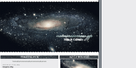 Új design? Ez egy olyan oldal, amiről első ránézésre a "túlságosan sok" kifejezés jut eszembe. A fejléc hatalmas, a maga 700as magassága bőven elég lenne mondjuk 500nak és még talán az is sok ebből a színkavalkádból. Merthogy nagyon erős színezés lett használva és bár az elemek aránylag a helyükön vannak, bizony nem túl jó sokáig nézegetni ezt a fejlécet, kiég az ember szeme, főleg, ha figyelembe vesszük a csillogó-villogó plusz cuccot, ami rákerült. Tényleg nem rossz, de egyszerűen soknak érzem... tudjátok, a kevesebb néha több! Amennyire jól kidolgozott - mégha túlságosan is sok - a fejléc, annyira összecsapott a lap kódos része. A középső moduldoboz nem rossz, de azért vannak hibái, oldalt pedig csak a chat van moduldobozban - bár az nem rossz -, minden más csak úgy oda lett téve és annyi. Ki kellene alakítani rendesen az oldalmodulokat, ez így borzasztóan összecsapott! Az alapbetűszín rózsaszín, azaz árnyalat, amiből megint csak túl sok - ti is észrevettétek hogy egyfolytában ezt ismételgetem? - van már a lapon. A középső modulok között amúgy hatalmas, felesleges, nem túl jól mutató hely tátong. A fejléc 10/7,7 pont meglenne, a kódolás azonban rettentően lehúzza, amennyi idő lett áldozva a hatalmas fejlécre, juthatott volna belőle arra is, hogy a kód normális meg legyen csinálva. Talán legközelebb megtalálja a szerkesztő a kellő egyensúlyt a kettő között!