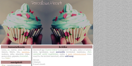 Első design: Egy kutyusos nyitó kinézet van fent elsőnek, a domináló színek pedig a rózsaszín és a lila, szóval elég lányosra sikerült a dolog. A fejléc tulajdonképpen nem rossz, de a textúrákból talán sok, a négyzethálós legalább halványabb lehetne. Ráadásul a háttér és a fejléc nem illeszkednek jól és a fejléc mellett van egy felesleges rózsaszín csík kimaradva. Az egyszerű kód-fejléc pároshoz a háttér már túlságosan sok egyszerűséget vonz magával, textúrákat tudok javasolni feldobásnak. Az alapmodulok nem rosszak, jók a modulfejlécszínek és a fehér modulháttér is rendben van, csak egyet nem értek: az oldalsó dobozok között egyáltalán nincs hely és összeérnek, középen meg kilométeres rés tátong a frissek között... Miért? Egyik sem jó, a köztes megoldásra lenne szükség. Az alapbetűszín amúgy okés, olvasható, akárcsak a formázások, melyek passzolnak ide. Az összes oldalmodul alján rejtélyes módon kimarad egy kis felesleges hely, le vele! Összességében a lapnak inkább rengeteg kis hibája van, mint egy nagy, de ezek együttesen szépen kihatnak az összképre, ami így már nem annyira nyerő. Aranyos, de van mint javítani rajta! Sok sikert hozzá!