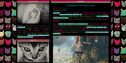 Második design: Ó, egy nagyon cuki macskás kinézet, mely színes, sötét és remekül mutat egy blogos oldalon! Ha jól látom viszont nem saját munka, hanem Chloé érdeme. Ez a háttér elképesztő, nagyon bejön - és mennyi színnel lehet dolgozni róla! A fekete modulháttér rendben van és a modulfejléc is jó. Az alapbetűszín olvasható, maga a lap átlátható. Az oldalmodulokba került fekete-fehér képeken további macskák láthatóak, ők is mind rendben vannak. A formázások amúgy mind passzolnak ide, a háttérről származnak, szóval jól mutatnak az összképben. A kellő rendezettség megvan - pont, mint az összhatás. Az összkép szerintem helyes és jól mutat. Megérte megvenni, szerintem aranyos a lap külseje!
