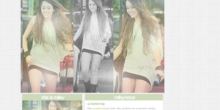 Második design: A főszerepben Miley Cyrus és az egész kicsit sötétebbre sikerült. A fő néznivaló a háttér: remekül lett összerakva, nekem az egész nagyon tetszik, minden egyes elemét rendben találtam, így kell ezt csinálni. Az egész elrendezés is simán bejön, jól mutat így az oldal. A moduldobozok is tetszenek, mind a középső, mind az oldalsókat nézve, ötletes ez a modulfejléc így és meglepő módon a modulcím is olvasható, pedig elő szokott fordulni ilyen típusú kinézeteknél ez a hiba. Itt nem. Az alapbetűszín rendben van, jól olvasható és a formázásokkal sincs semmi gond, mindegyik passzol a másikhoz és az összképbe is. Az összhatás simán megvan! Az egész oldalfelépítés tetszik nekem, elégedett vagyok az oldal összképével, rendezettségével és mindennel, amit látok. Ez egy szép munka!