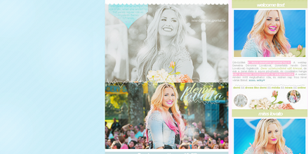Első design: Aranyos, inkább tavaszias, mint nyárias vagy őszies kinézet a visszatérő kinézet, természetesen Demi-vel a középpontban. Demi felhasznált képei nagyon édesek, megértem miért ezekből készült el az új dizi - ráadásul a színek is mind szuperek! A főkép ötletesen lett megcsinálva, bár a bal felső sarokban lévő cucc, amin a szöveg is van, felesleges, a szöveg amúgy sem olvasható. A színezések amúgy tetszenek mind ezen, mind a kis, oldalmodulokba került képeken, melyek teljességgel rendben vannak. A háttér jó választás volt, ügyesen lett összeállítva. A kódolás.. mind a középső, mind az oldalsó moduldobozok okésak, egyszerűek, de semmi gond nincs velük. Az alapbetűszín olvasható, a formázások mind jók, passzolnak az összképbe. A kellő rendezettség megvan, különösen tetszenek a középen használt kis zöld dobozok és az elitikonok is szépek. Minden a helyén, van összhatása és nekem tetszik az összképe - grat hozzá!