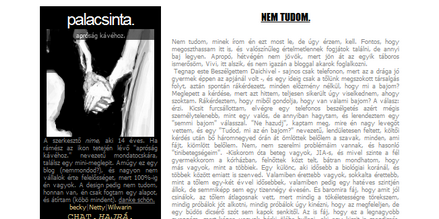 Nyitó design: Egy kicsit nehéz dolgom van, hiszen bár a design nagyon édes - szó szerint! -, nem tudom, hogy ebből mennyi munka a tied. A választás mindenképpen a te érdemed: sikerült egy tökéletesen blogos lapra illő oldalfejlécet választanod, és az elrendezés is igencsak előnyös: egyszerű, átlátható. Nem tudom, hogy a CSS a te munkád-e vagy sem, egy pár szót mindenképp ejtek róla: színeiben nagyon szépen passzol a fejléchez, olvasható, szolid és visszafogott - talán csak a modulcímek lelógásával nem vagyok teljesen megelégedve, de ízlések és pofonok, avagy kinek a pap, kinek a paplan. :) A helyedben azért odafigyeltem volna a háttérre, egy picit lehetne szélesebb, hogy ne legyen egy fehér sáv a képernyő szélén, valamint elkelt volna egy kis formázás a blog modul Mit szólsz hozzá? sávjához is. Hogyha nem tudod, hogy ezt hogyan kell, az AR-Design részletes CSS-magyarázata a segítségedre lehet.