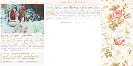 Új design? Letisztult, egyszerű, blogra illő kinézet - olyasmi, amit Ashley-től már megszokhattunk. A virágos háttér nekem nagyon tetszik, remek választás volt, ráadásul a színei is annyira megnyugtatóak, "nyugodtak", jó ránézni és hát igen, a színek megalapozzák a kódolásban felhasználható árnyalatokat is, ezért fontos hogy milyen a háttér. De minden a legnagyobb rendben van vele! Nagyon tetszenek a képek is, melyek az oldalmodulokba kerültek, az összes ugyanolyan békésebb hangulatú mint amilyen a lap összképe. A modulfejléc rendben van, akárcsak a világos, egyszerű modulháttér. Az alapbetűszín olvasható és szerintem a formázások is mind rendben vannak. A lap rendezettsége továbbra is remek, nincs rá panasz. Az összhatás persze megvan és az összkép is tetszetős, "egyszerű,de nagyszerű" kategóriás munka. ;)
