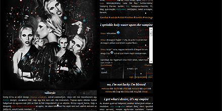 (Nyitó?) design: Már lekerült a nyitódesign, és valami sokkal Cannibalosabb jött a helyére: egy sötét alapú külső Lady GaGával a főszerepben. Bár Cannibal kijelentette, hogy szerinte a látogatók 90%-a számára olvashatatlan lesz, nálam tökéletesen működik. Nem vagyok érzékeny az apró betűkre, amíg azok eléggé elütnek a háttértől, és ez itt teljes mértékben rendben van. A fejléc és a formázások harmóniája is abszolút jelen van, épp csak a lilával nem tudok mit kezdeni a hírek láblécében, de tulajdonképpen az sem lóg ki az összhangból, csak épp a fejlécen nem találom. Nekem az összhatás nagyon tetszik: egy erőteljes, hangsúlyos designnal állunk szemben, kifejezetten az a kategória, ami vagy nagyon tetszik valakinek, vagy nagyon nem. Remélem, az előbbi csoportban vagyunk többen. :)