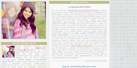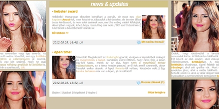 Első deisgn? Egyszerű barnás kinézet tárult a szemem elé Selena Gomezzel a főszerepben, amikor megnyitottam a lapot Megemlíteném, hogy csodás képeket válogattál össze, remek színekkel. A modulfejlécek szépséghibája a légypiszoknyi betűméret, amivel ráfirkantottad a menük címét. Ez nem mutat valami szépen, s az elhelyezése sem tökéletes, úgy gondolom szebben nézne ki a képek alján lenne nagyobb méretben. A css remek, hiszen passzol a képekhez, a háttérhez, illetve olvasható rajta minden: tökéletes. Ami még szemet szúrt, hogy túl széles az oldal, ha ezt kicsit beljebb vennéd máris arányosabb lenne. A külsőről ennyi, jöjjön a tartalom..