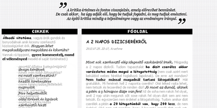 Új design? Nekem ez igazából sokkal jobban tetszik, mint az előző. Vagyis nem tudom, hogy az előző volt-e amire gondoltam. Volt egy hasonló 'fekete-fehér' kinézetetek is. :D Szerintem jó lett az oldal összképse, és ízlésesen is lett megoldva minden (majdnem minden). A fejlécen egy idézetet találhatunk. Nekem tetszik az idézet - a szövege, és a kinézete is - de miért nem igazítottátok középre? Így kicsit furcsán mutat. A háttér szerintem passzol a designhez. A kiemelések szerintem jól lettek megoldva - nem szeretem a 'fekete-fehér' megoldást, de ez kifejezetten tetszik. Kivéve a Comic Sans betűtípust. Szerintem nem mutat jól egy lapon. Az oldalsó modulokban hol balra, hol jobbra van igazítva a szöveg. Először nem tetszett, és rendezetlenségre utalt, de később rájöttem, hogy talán még jól is mutat. :D Csak hozzá vagyok szokva, hogy mindenütt sorkizárt a szöveg, de nekem tetszik, hogy próbáltátok máshogy is megoldani. A modulfejlécekkel sincs bajom. Szépek és igényesek.