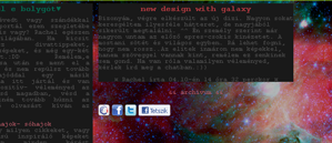 Új dizi? A háttér, ami egyben felér egy fejléccel gyönyörű. A színei, a formái, lenyűgüző, komolyan! Tökéletes választás volt. A kódolás nagyon egyszerű és nagyszerű. Nincsenek modulfejlécek, de nem is hiányoznak. A bejegyzésekben és oldalmodulokban gyakrabban használhatnál kiemeléseket, mert úgy élvezetesebb lenne olvasni a szövegeket. A chatbe nem ártana egy kevéske színt vinni. A modulhátterek és egyebek is okésak. Ez egy tipikus egyszerű blogos design, semmi extra, mégis nagyon szép. Gratulálok, nagyon szép kinézetet hoztál össze!