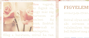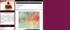 Új dizi: Vintage hatást keltő designt láthatunk itt, tavaszi feelinggel. A lapon oldalfejlces megoldást láthatunk. Oldalt a kép jól tükrözi a blogger egyediségét. A felirat a képen szép, csak tehettél volna bele egy kicsi rózsaszínt, én azt valahogy hiányolom belőle. A kódolásba nem akarok belekötni, nincs is rá okom, nagyon jól sikerült. Engem a frisseknél zavar, hogy nincs a bejegyzéseknek címe, így eléggé egybeolvad az egész. Az oldalmodulok rendben vannak. A chat színei okésak és a kis képek oldalt feldobják az egész oldalt. Az lap háttere brilliáns választás volt, az oldal összképe pedig természetesen megvan és tetszetős is.