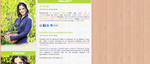 Új diziről? Hmm... a domináló szín a zöld, ez világos. Ezek a képek remekek Dóriról, mindegyiken gyönyörű és a képek minőségéért is jár egy pirospont! Tetszik ez az oldalfejléces megoldás, de a háttérrel lehetett volna jobban játszani: a képet és az oldalmodulokat le lehetett volna választani a középső résztől - tehát ezek mögött futott volna a világoszöld háttér, majd faháttér jön és majd csak a középső rész mögött fut megint a zöld. Nem tudom, hogy érhető-e mire gondolok. Szóval, visszatérve a képhez. Az oldalmodulokban lévő képek szépek. A kódolás is jól sikerült, a modulfejléc és a modulháttér párosa okés, a formázások szépek. A faháttér bejön, a háttérről a többi véleményemet már feljebb elmondtam. Nem rossz, az biztos és kellemes a hangulata, olyan kis tavaszias! Van összhatása és szép az összképe - grat hozzá! :)