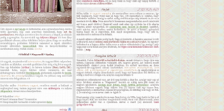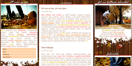 Új design? Szeretem, mert a munkáidon mindig látszik, hogy te készítetted őket, összetéveszthetetlen a stílusod. A mostani design egy egyszerű, oldalfejléces blogos kinézet. A CSS minden színe a fejlécről származik - amire egyébként elkelt volna egy felirat -, de valahogy mégsincs meg az a harmónia. Talán egymással nincsenek eléggé összhangban a színek, nem tudom. Végeredményben nem zavaró a dolog, csak éppen lehetne jobb is. A másik dolog, hogy a CSS-hez túl halvány a háttér, és a színvilága sem éppen ugyanaz, mint a fejlécképnek - én egy sötétebb, barnásabb hátteret választottam volna a helyedben. A blogot nem értem, hogy miért cikkes modulban írod, szentül hiszek benne, hogy blogosban jobban nézne ki, de végülis így sem rossz. Ha az ember elmélyed a részletekben, mindennek megtalálja a helyét, de van az egészben egyfajta nyugtalanság, valami, ami megbontja a harmóniát - és nem tudnám pontosan megmondani, mi az. Abba is hagyom a sötétben tapogatózást, és összesítésképp 90%-ot ítélek ennek a designnak.