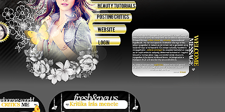 Új design? Ugye a szépség és a kritika egy olyan téma, amely cikkek írását követeli meg. Nos, az ilyen lapokra nem épp a HTML-design a legjobb választás, hiszen itt a cikkeken, a szöveges tartalmon van a lényeg, és annak olvashatóságán, élvezhetőségén. Nem túl előnyös elvonni a figyelmet erről egy hatalmas, csillogó HTML-designnal. A fejléc nekem túlságosan összecsapottnak tűnik. A fehér virágokat a helyedben nem kevertem volna össze az ezüsttel és az arannyal, valamint a főkép színezése sem passzol az összképbe. Nem értem, hogy miért van mellette egy fehéres-sárgás "árnyék", és azt pláne nem, hogy miért ekkora. A navigáció nem szép, csak rádobáltad a feliratokat, de egyik sincs a sávok közepén, főleg a "Login" felirat csúszott el nagyon csúnyán. Az üdvözlőszöveg sokkal jobban nézne ki a fehér részek nélkül, a feketét és a sötétszürkét kellett volna váltogatnod. A középső és oldalsó modulokban sincs minden rendben. Az oldalsó modulok telességgel olvashatatlanok, ráadásul a középső rész el is csúszik legalább két pixellel a felső résztől - de ez már elenyésző hiba az olvashatatlanság melett. A középső modulok is elcsúsznak, valamint a gyémántos láncokat nem radíroztad le rendesen felülről. A félkövér formázás árnyékolása elég csúnyán hat a fekete háttéren. A hatalmas by: Kriszti felirat teljesen fölösleges, helyette inkább egy dátum rész kellene. Valamint mind az oldalsó, mind a középső moduloknál használnod kellett volna egy kis behúzást, hogy a szöveg ne érjen ki egészen a modulok széléig.