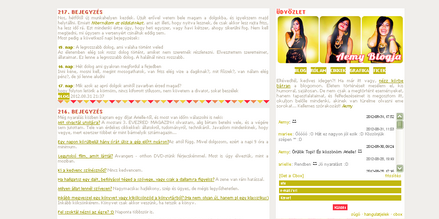 Új design? Egy egyszerű, fekete fehér alapon fekvő színes designt láthatunk a lapon. A kedvencem a háttér, nagyon szeretem ezt a képet - kár, hogy több helyen is megtörik. Egyetlen kisképet láthatunk, ami rendben is van, ugyanis az utolsó két bejegyzéshez került egy-egy gif, ami helyettesíti az oldalsó képeket. A modulfejlécek tetszenek, és ezek a pasztelles színek is rendben vannak, csak a dőlt szöveg a színe miatt olvashatatlan. Az aláhúzott szöveg egy pixellel kisebb, mint a többi, és nem értem, miért, ha ugyanúgy 11 px-es lenne, mint a többi, sokkal jobban nézne ki. Többet nem is tudok mondani a designról, mivel összességében egy viszonylag rendezett, viszont kissé unalmas kinézetről beszélhetünk, amelyet én 90%-osnak tartok.